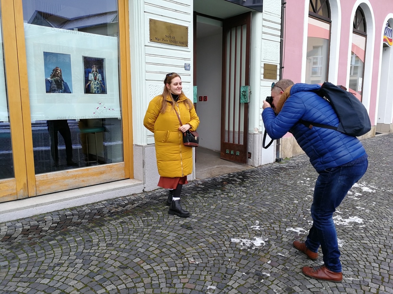 Laureátka Ohlédnutí 2020 Iva Gejdošová navštívila svůj rodný region a při té příležitosti jsme jí přišli přímo k jejím vystaveným fotografiím poděkovat a předat kinodárky. Současně jsme konzultovali také její souhlas s nabídkou samostatné minivýstavy za rok a laureátka...s radostí...přijala! Dokonce, a to je potěšitelné, velmi chválila letošní veřejnou venkovní podobu výstavy a chtěla by pro svůj projekt zvolit podobnou formu. To jest fotografie do veřejného venkovního prostoru města. Foto: Marek Malůšek, Josef Korvas