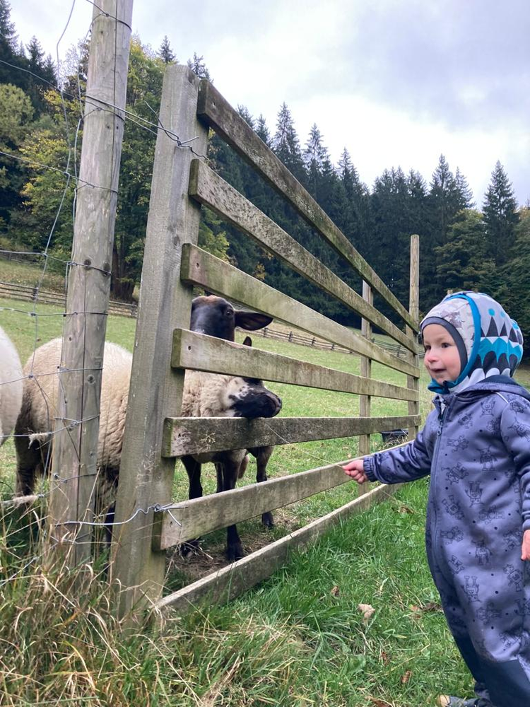 Tento chlapec v krásný pozimní den obdivuje ovečky. Počkáme pár let, jaké ovečky či kočky bude obdivovat.