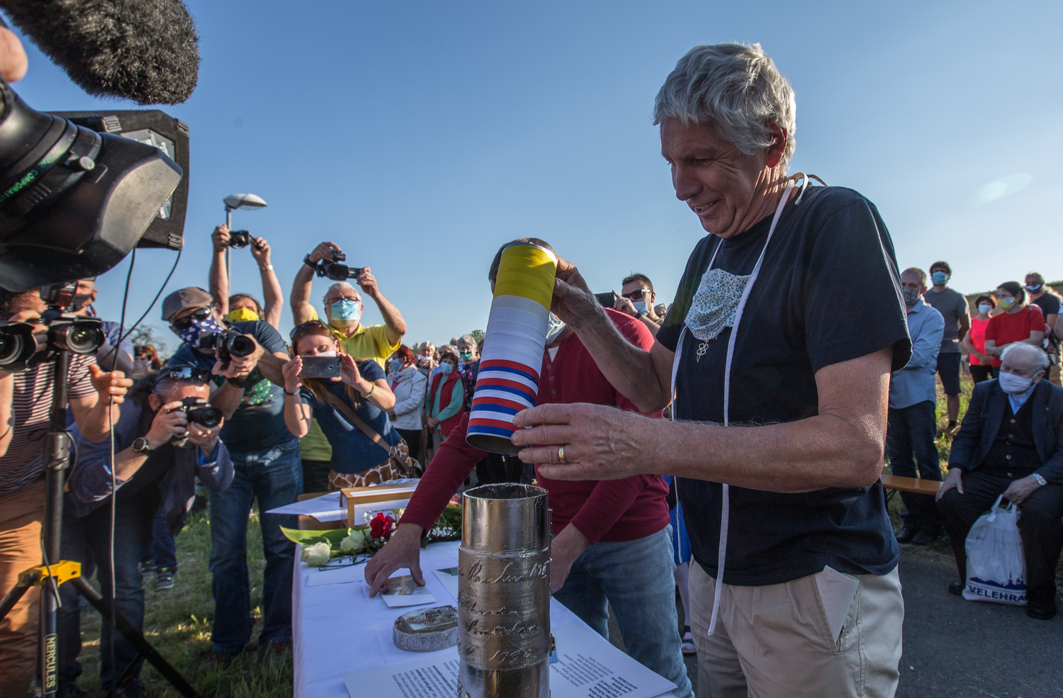 Otmar Oliva vkládá dokumenty do schránky, která bude uložena v základech památníku.