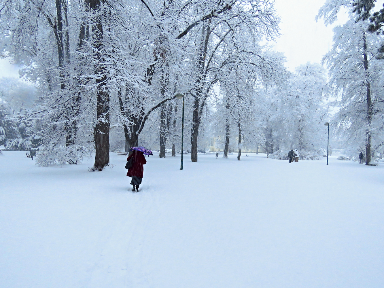 Smetanovy sady v Uherském Hradišti, ráno po silném sněžení ještě nejsou prohrnuté cesty