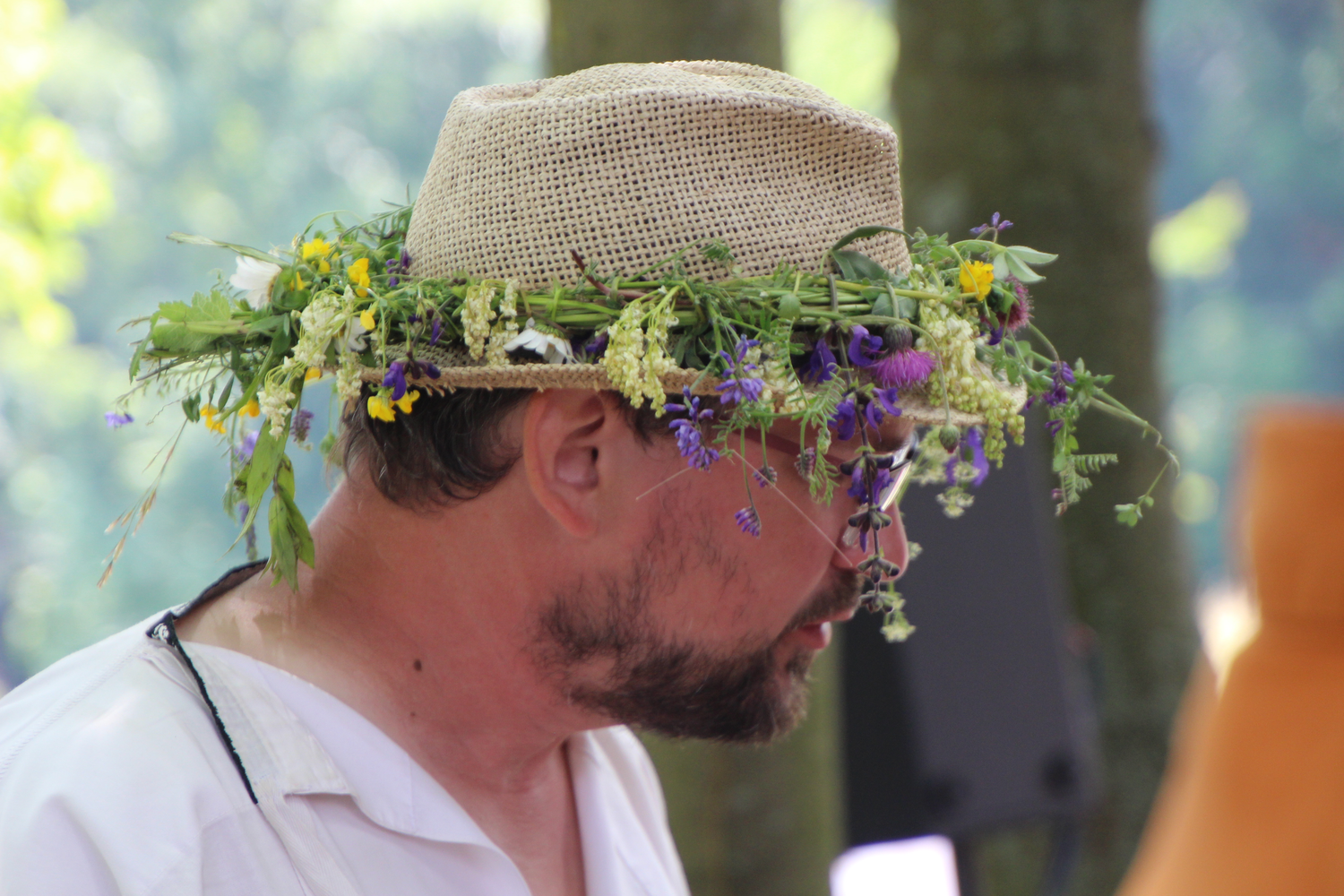 Klobúk kosce ozdobený lučními květinami na Horňáckém kosení orchidejových luk v Malé Vrbce