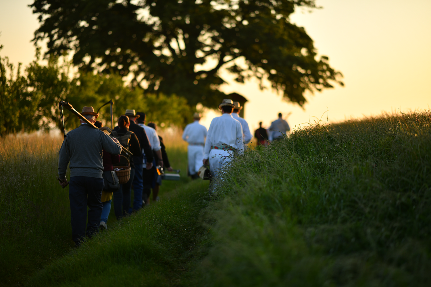 Parta kamarádů se rozhodla společně pokosit velkou louku jedno z nich. Když spolu, tak v krojích, jako kdysi.