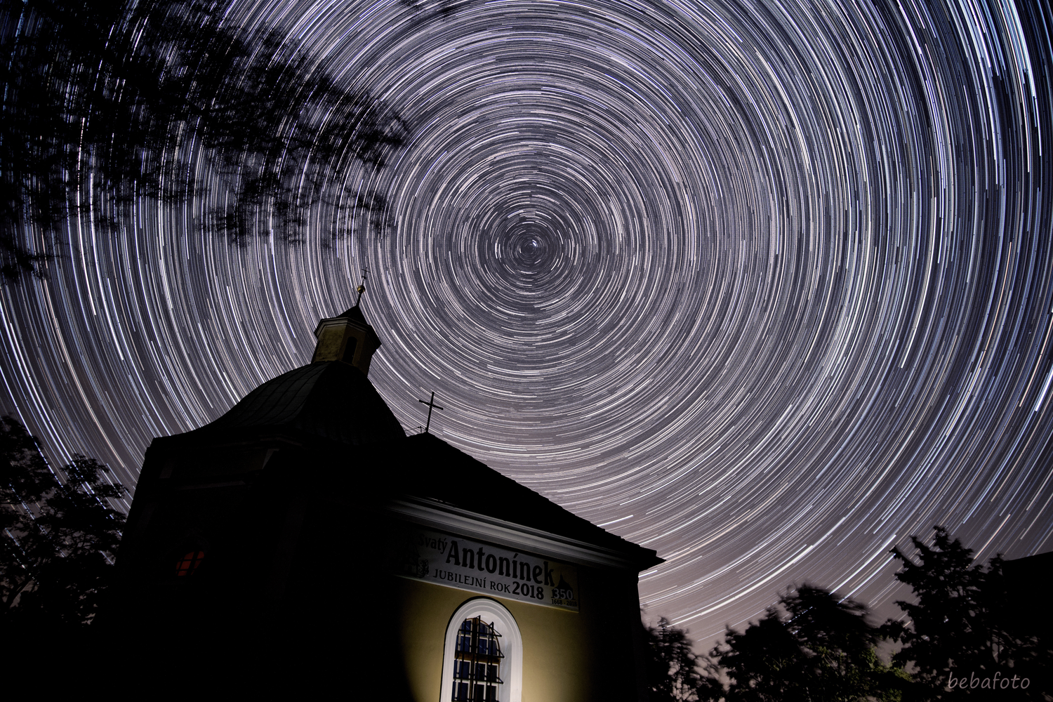 Svatý Antonínek v dvěstěsedmdesáti expozicích a spojených do jedné Startrails fotografie bez zkreslení