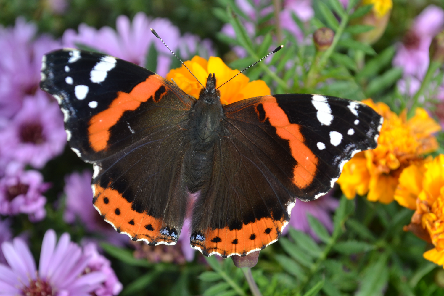 Babočka admirál na rozkvetlém záhonu ve Štěpnicích Babočka admirál na rozkvetlém záhonu ve Štěpnicích