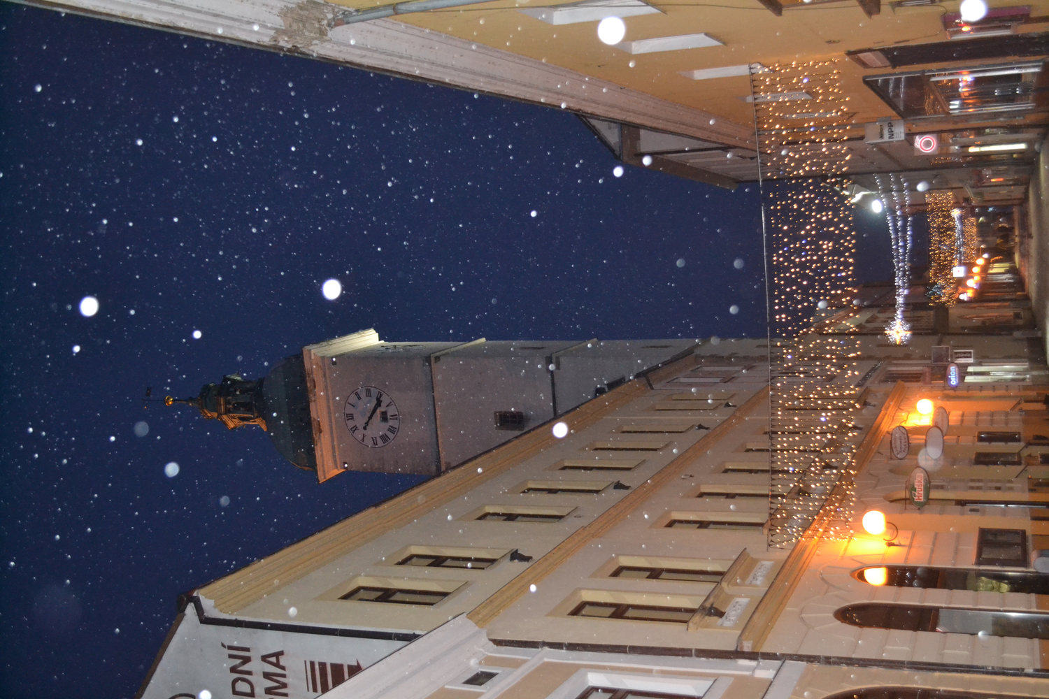 Stará radnice v sněhových vločkách vznášejících se do Prostřední ulice Stará radnice v sněhových vločkách vznášejících se do Prostřední ulice