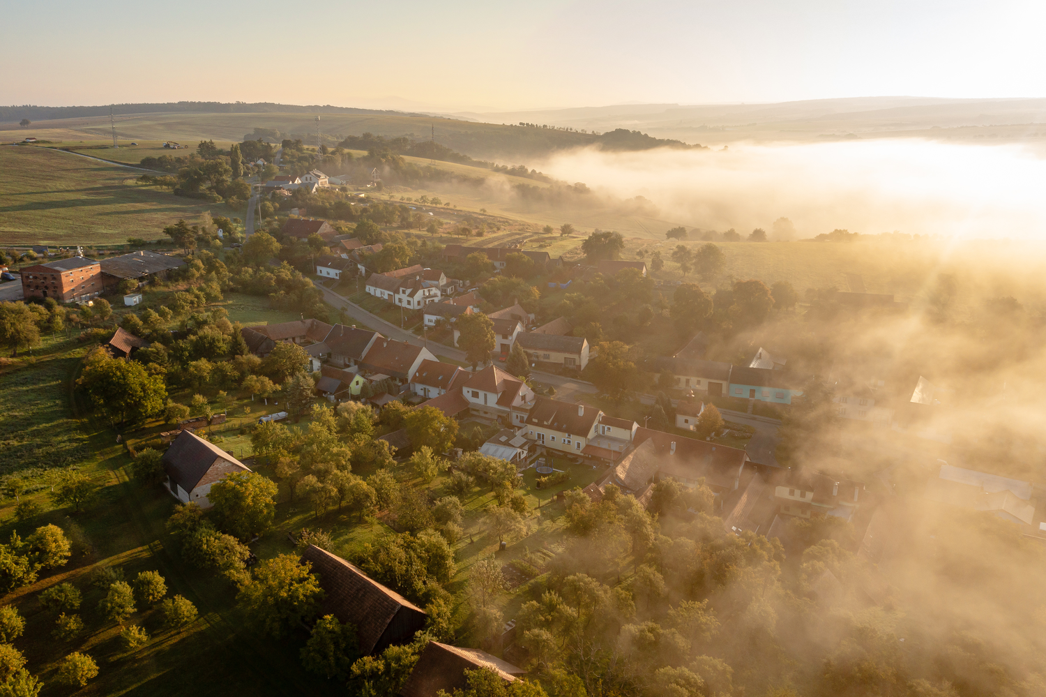 část obce Lhotka v srpnové mlze