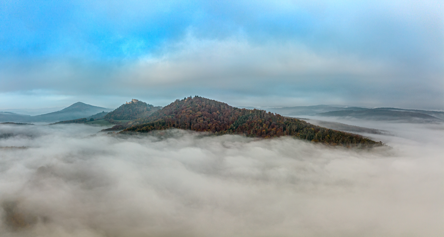 Tři dominanty slováckých Chřibů vystupující z inverze jako ostrovy.