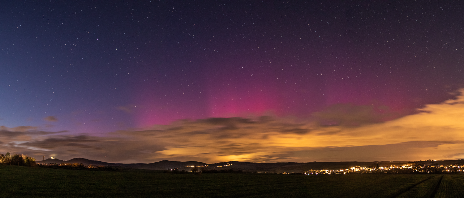 V pátek 3. 11. vyvržený oblak sluneční hmoty zasáhl v neděli 5.11. Zemi. Vyvolal silnou polární záři, která na několik okamžiků ozářila velkou část oblohy i u nás na Jižní Moravě. Hvězdné obloze na snímku dominuje souhvězdí Velkého vozu.