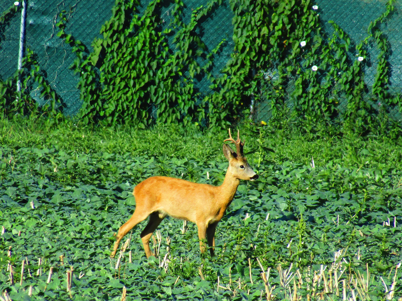 Srnec v sadě u plotu zahrady